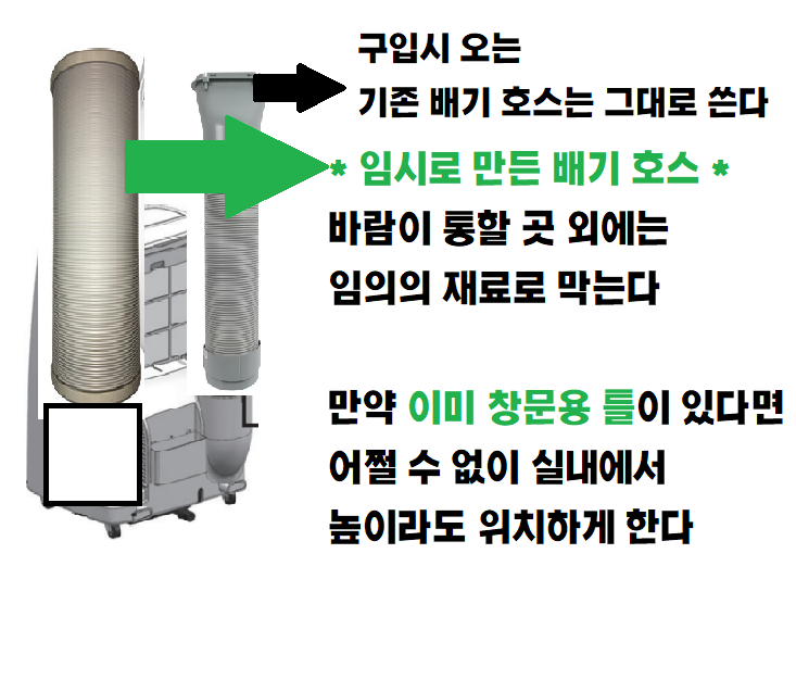 이동식 에어컨의 배기 호스는 크고, 길고, 보통 사용되는 재질 자체에 열이 잘 올라서